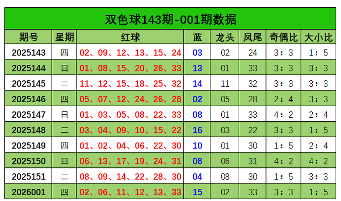 双色球第2026001开奖奖号:红球02、06、11、12、13、33东莞市大朗发达五金制品厂,蓝球15。红球龙头02,凤尾33,奇偶比为3:3,大小比1:5。蓝球开出15。