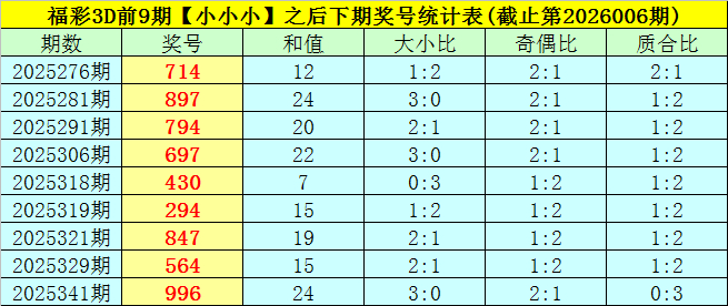 一、上期转头:福彩3D第2026006期奖号为:244,奖号类型开出组三东莞市大朗发达五金制品厂,大小比为0:3,奇偶比为0:3,和值为10,跨度为2,012路比为0:2:1。